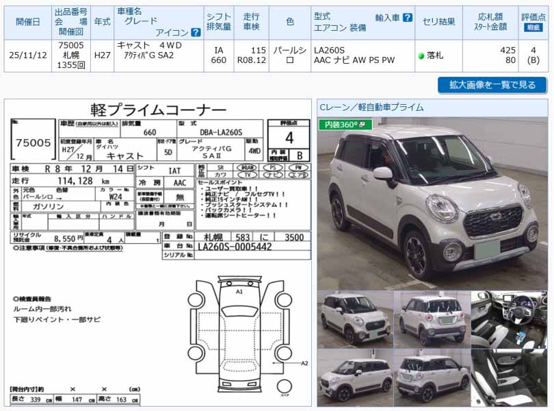 2015 Daihatsu Cast 2015 Daihatsu Cast (1)2015 Daihatsu Cast (11)2015 Daihatsu Cast (2)2015 Daihatsu Cast (10)2015 Daihatsu Cast (7)2015 Daihatsu Cast (6)2015 Daihatsu Cast (4)2015 Daihatsu Cast (5)2015 Daihatsu Cast (3)2015 Daihatsu Cast (8)2015 Daihatsu Cast (9) Auction Number 75005 Auction Rate 4 Auction Type USS Sapporo Purchase Y/M 2025/11 Bid Price Won ¥425.000 Model Code LA260S Manufacture Y/M 2015/12 Mileage 114.128 km Engine Capacity 660cc Свяжитесь с нами