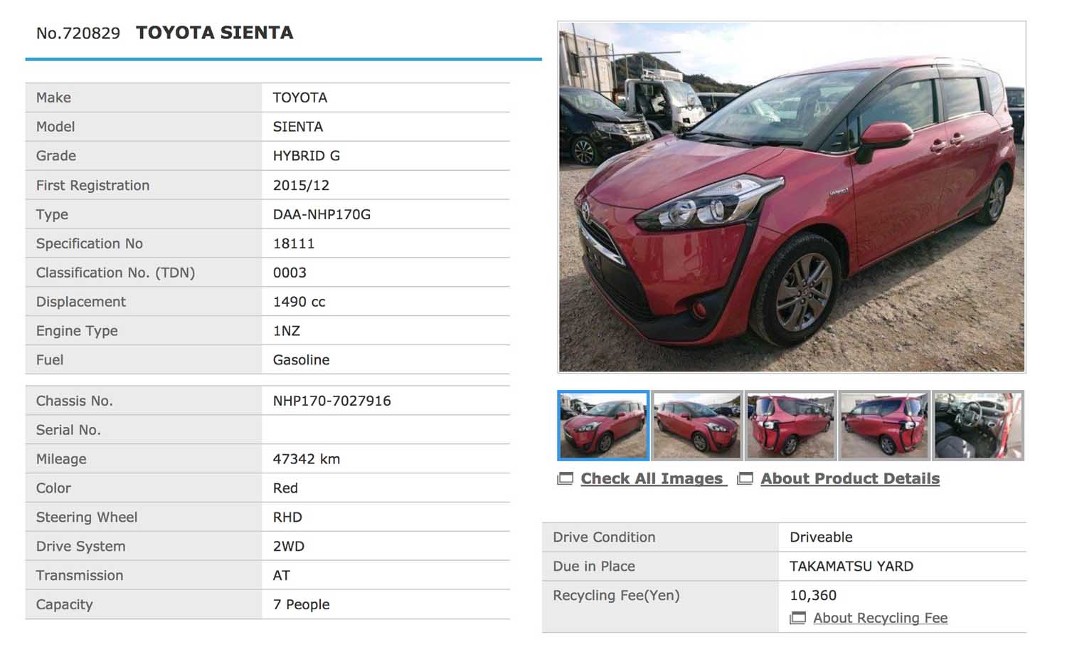 2015 Toyota Sienta 123456789101112131415161718 Auction Number 720829 Auction Rate NONE Auction type TAU Bid Price Won ¥808,000 Model Code NHP170G Manufacture Y/M 2015/12 Mileage 47,342 km Engine Capacity 1,490cc Contact us!