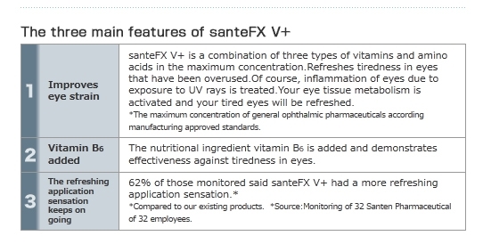 SanteFX V+ has features eye drops that nutritionally replenish as well leaving you feeling refreshed. In addition to two types of amino acids, vitamin B6 has also been added.